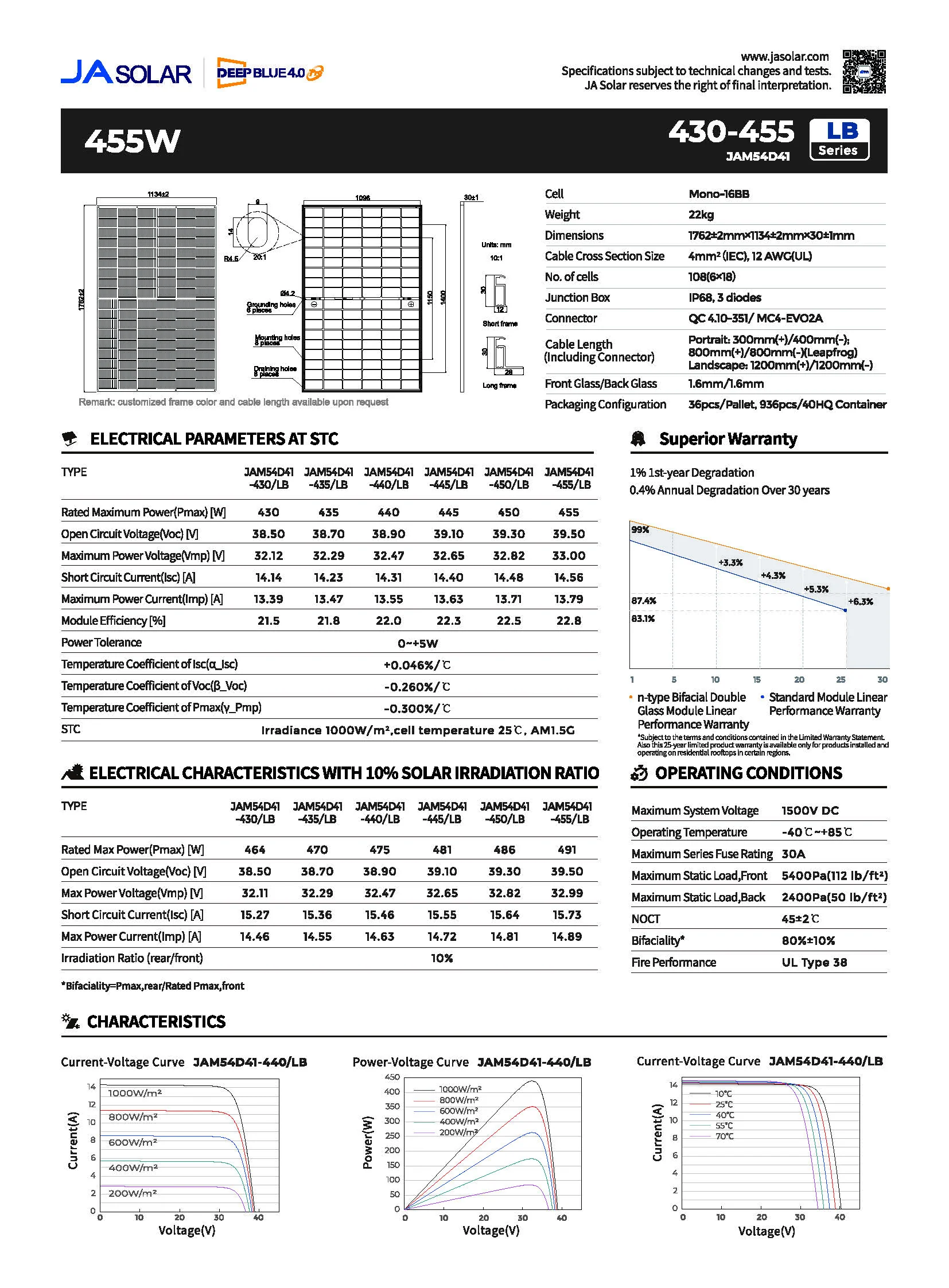 12x 435 Wp Solarpanels der Marke JaSolar Modell JAM54D41 (insg. 5220 Wp) ‒ 12 Jahre Herstellergarantie, 30 Jahre lineare Leistungsgarantie